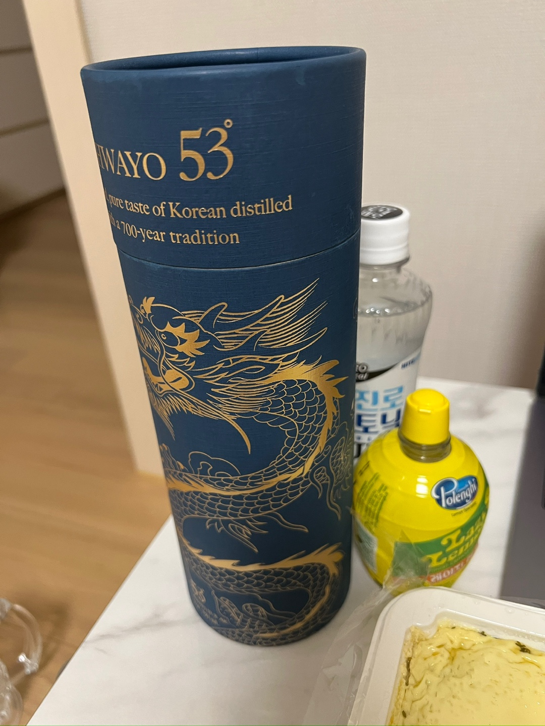 오늘의 술은 ‘화요 53도 청룡 에디션’. 24년산, 700년 전통의 한국 증류주라는데, 저는 아쉽게도 패스… 와이프만 마셨습니다. (솔직히 53도는 아직 제 레벨이 아닌 듯ㅋㅋ) 옆에서 시원하게 한잔 하는 모습 보니 술맛도 좋아 보였어요!