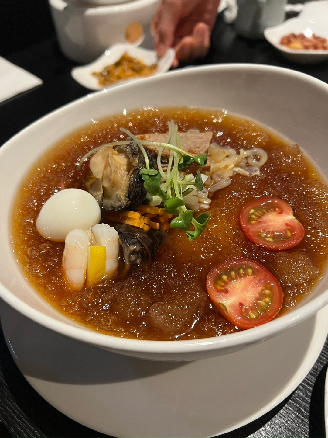 This one looked incredible—shaved ice broth with shrimp, quail egg, cherry tomatoes, abalone… it was basically a photoshoot in a bowl.