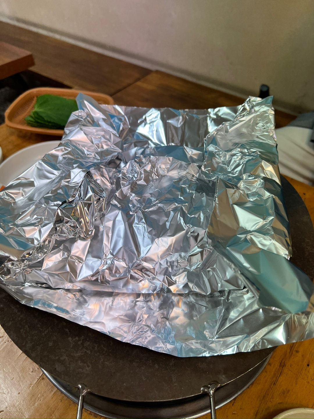 Then, the main event arrives: a hot grill lined with foil, waiting for the thick, glistening pieces of hagfish to sizzle away.