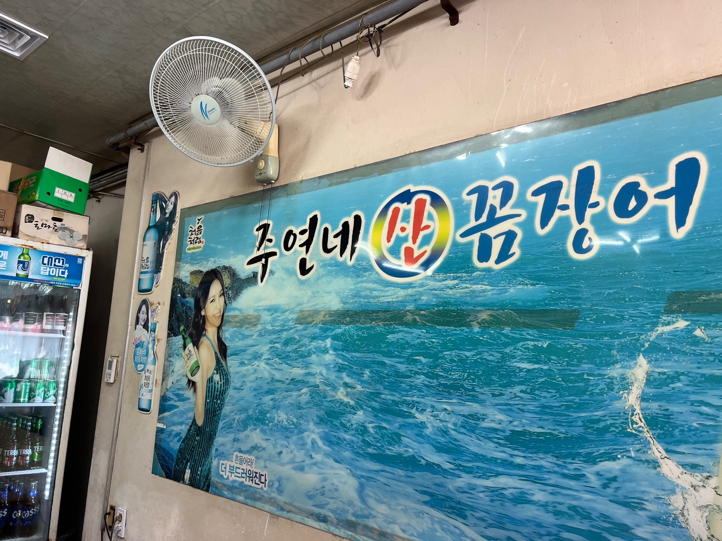 From the outside, Ju-yeon’s is hard to miss. A bold red sign shouting “Fresh Hagfish,” seafood tanks bubbling by the entrance, and that unmistakable aroma of the sea drifting through the air.
