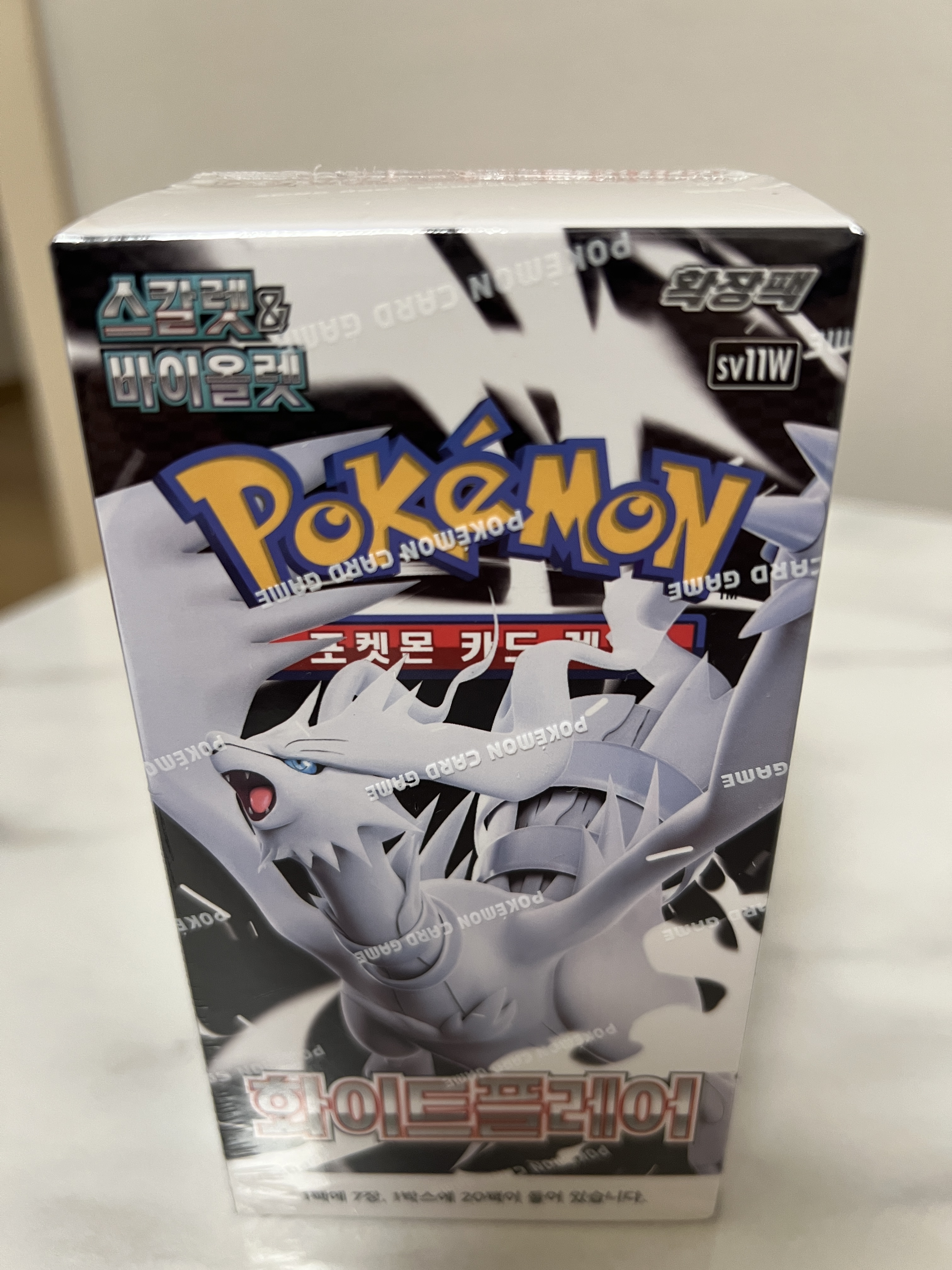 포켓몬 카드 수집가라면 누구나 설레는 순간, 바로 박스깡! 이번에 저는 **스칼렛 & 바이올렛 시리즈 최신 확장팩 ‘화이트플레어’**를 풀어봤습니다. 박스 전면에는 위엄 넘치는 레시라무가 자리 잡고 있어, 뜯기 전부터 강렬한 불꽃의 기운이 느껴지더군요.
