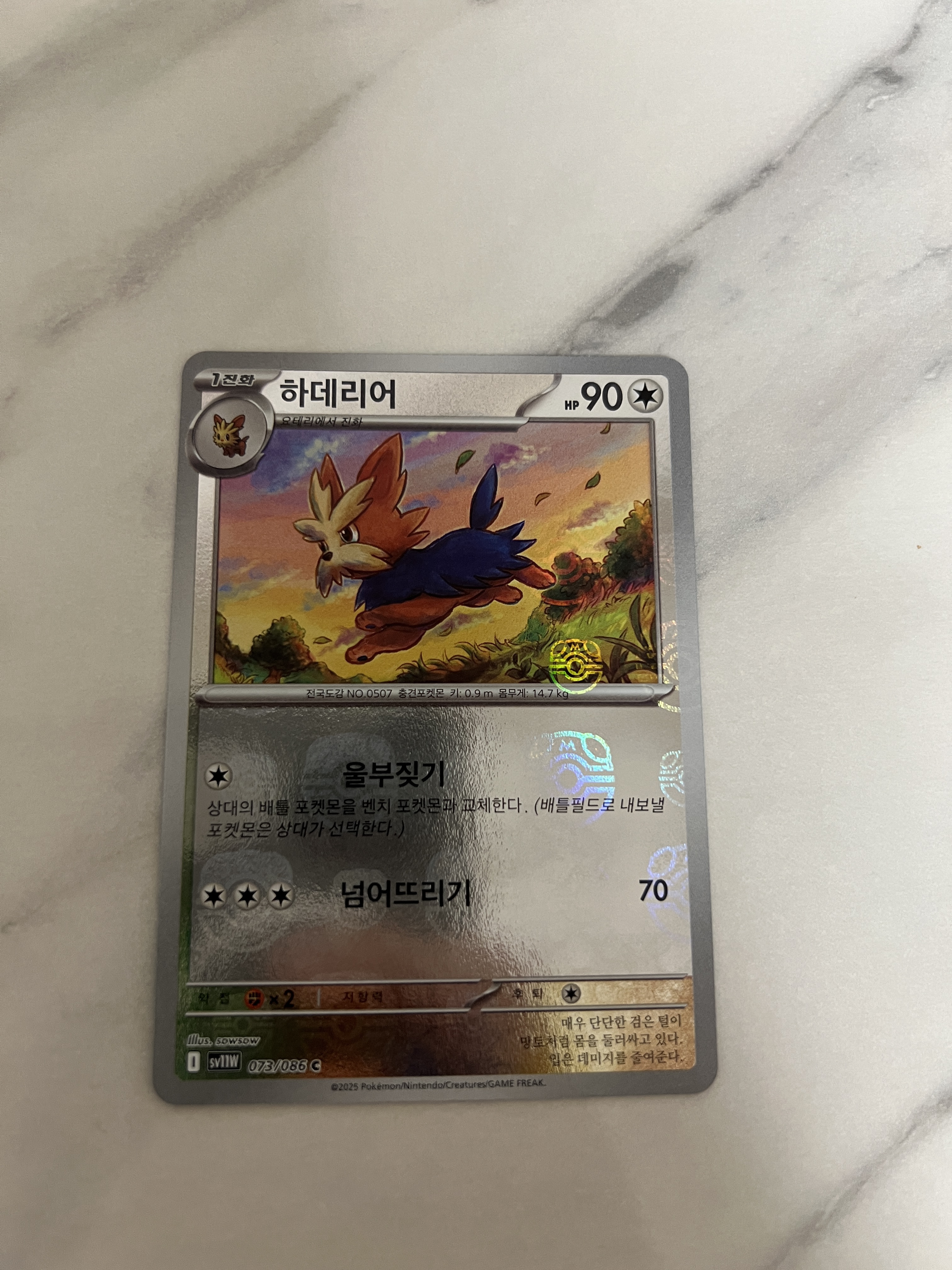 생각보다 귀여운 일러스트로 그려진 하데리어 미러 카드도 건졌습니다. 반짝이는 홀로 효과 덕분에 흔한 C 등급 카드도 특별해 보이네요. ‘울부짖기’와 ‘넘어뜨리기’라는 스킬명이 왠지 귀엽지만 실전에서 은근히 견제할 수 있는 카드입니다.